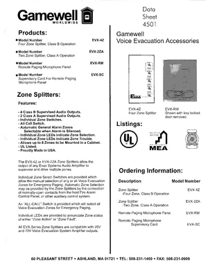 Datasheet for the Gamewell FCI EVX Series Voice Evacuation Accessories. Document No: 4501. 4 models including EVX-4Z, EVX-2ZA, EVX-RM and 1 additional variants. Engineering specifications, wiring diagrams, and mounting dimensions.