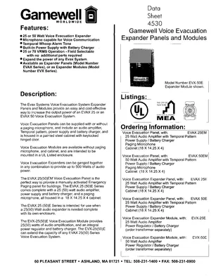 Datasheet for the Gamewell FCI Gamewell Voice Evacuation Expander. Document No: 4530, Rev: EVEX0598R1. 6 models including EVAX 25EM, EVAX 50EM, EVAX 25E and 3 additional variants. Product features, environmental operating limits, and compatibility data.