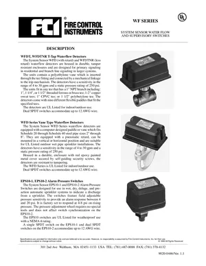 Datasheet for the Gamewell FCI WF Series Water Flow Switches, published in 1998. Document No: 9020-0446, Rev: 1.1. 19 models including WFDT, WFDTNR, WFD20 and 16 additional variants. Product features, environmental operating limits, and compatibility data.