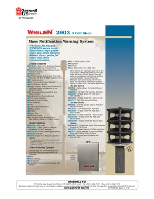 Datasheet for the Gamewell FCI Whelen 2903 Series, published in 2006. Document No: GF11686B, Rev: B. 21 models including 2903, WPS2903, SBC280 and 18 additional variants. Detailed technical specifications, electrical ratings, and agency listings.