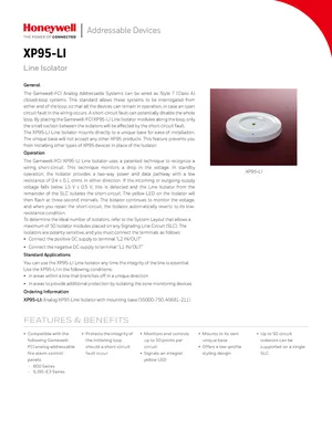 Datasheet for the Gamewell FCI XP95-LI, published in 2019. Document No: CS-2051, Rev: E. 6 models including XP95-LI, 55000-750, 45681-211 and 3 additional variants. Product features, environmental operating limits, and compatibility data.