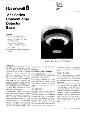 Datasheet for the Gamewell FCI Z77 Series Conventional Detector Base, published in 1996. Document No: 611, Rev: 10/96 (revised). 11 models including Z77B, Z77F, Z77FR and 8 additional variants. Detailed technical specifications, electrical ratings, and agency listings.