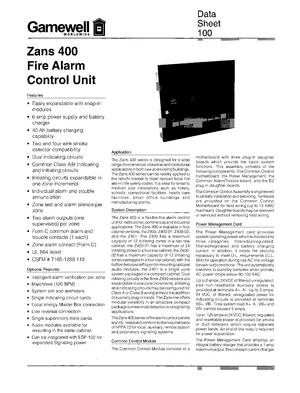 Datasheet for the Gamewell FCI Zans 400, published in 1999. Document No: 100, Rev: revised. 4 models including Z400, Z400-01, Z400-02 and 1 additional variants. Product features, environmental operating limits, and compatibility data.