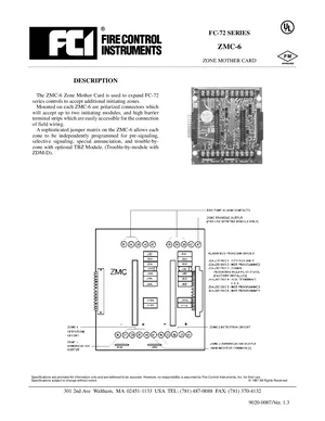 Datasheet for the Gamewell FCI ZMC-6, published in 1997. Document No: 9020-0007, Rev: 1.3. 4 models including ZMC-6, FC-72, TBZ and 1 additional variants. Engineering specifications, wiring diagrams, and mounting dimensions.