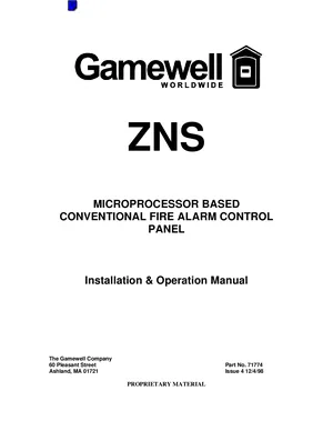 Installation, Operations, and Programming Manual for the Gamewell FCI ZNS, published in 1998. Document No: 71774, Rev: Issue 4. 17 models including ZNS, INS-2, 31014 and 14 additional variants. Complete system installation, daily operation procedures, and detailed programming configurations.
