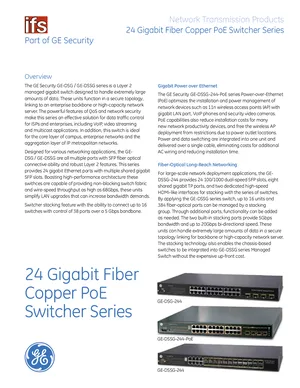 Datasheet for the GE Security 24 Gigabit Fiber Copper PoE Switchers, published in 2010. Document No: 60055. Models GE-DSG-244, GE-DSSG-244-PoE and GE-DSSG-244. Product features, environmental operating limits, and compatibility data.