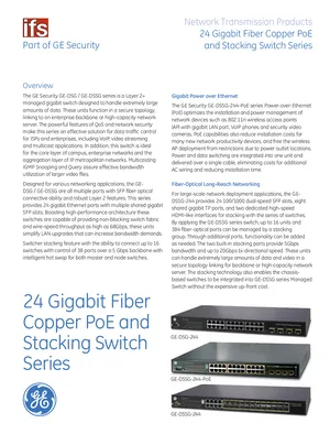 Datasheet for the GE Security 24 Gigabit PoE and Stacking Switches, published in 2010. Document No: 003-3298, Rev: 2010/02. Models GE-DSG-244, GE-DSSG-244-PoE and GE-DSSG-244. Detailed technical specifications, electrical ratings, and agency listings.