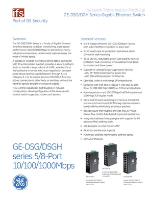 Datasheet for the GE Security GE-DSG/DSGH Series Gigabit Switches, published in 2010. Document No: 60342, Rev: 2010/01. Models GE-DSGH-5, GE-DSGH-8 and GE-DSG-8. Product features, environmental operating limits, and compatibility data.