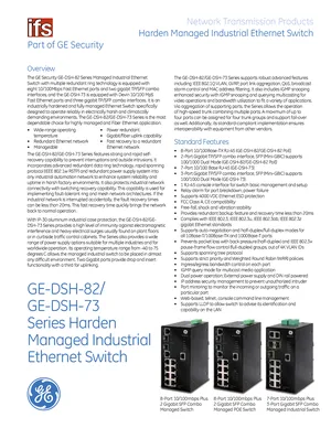 Datasheet for the GE Security GE-DSH-82/GE-DSH-73 Series Switch, published in 2010. Document No: 60342. Models GE-DSH-82, GE-DSH-73 and GE-DSH-82-PoE. Product features, environmental operating limits, and compatibility data.