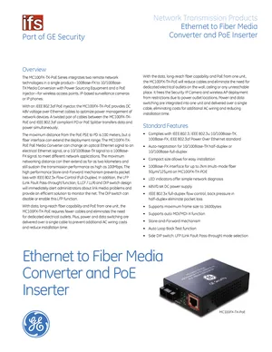 Datasheet for the GE Security MC100FX-TX-PoE, published in 2010. Document No: 60342A, Rev: A. Model MC100FX-TX-PoE. Product features, environmental operating limits, and compatibility data.