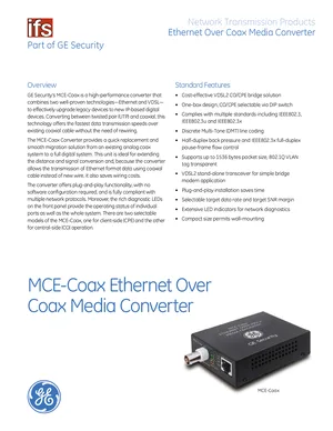 Datasheet for the GE Security MCE-Coax, published in 2010. Document No: 60342F. Model MCE-Coax. Detailed technical specifications, electrical ratings, and agency listings.
