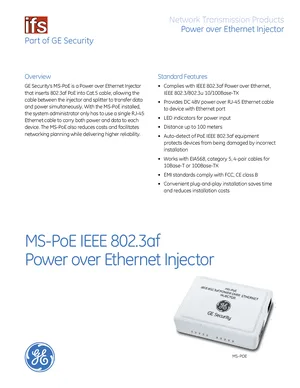 Datasheet for the GE Security MS-PoE, published in 2010. Document No: 003-3304, Rev: 60342F. Model MS-PoE. Engineering specifications, wiring diagrams, and mounting dimensions.