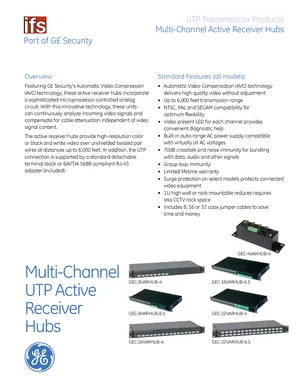 Datasheet for the GE Security Multi-Channel UTP Active Receiver Hubs, published in 2010. Document No: 003-3287, Rev: 60364F. 7 models including GEC-4VARHUB-4, GEC-8VARHUB-4, GEC-16VARHUB-4 and 4 additional variants. Product features, environmental operating limits, and compatibility data.
