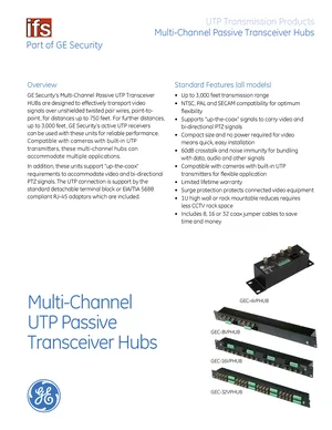 Datasheet for the GE Security Multi-Channel UTP Passive Transceiver Hubs, published in 2010. Document No: 003-3288, Rev: 60364E. 4 models including GEC-4VPHUB, GEC-8VPHUB, GEC-16VPHUB and 1 additional variants. Engineering specifications, wiring diagrams, and mounting dimensions.