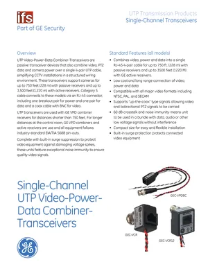 Datasheet for the GE Security Single-Channel UTP Transceivers, published in 2010. Document No: 003-3286, Rev: 60364B. 5 models including GEC-VCR, GEC-VPDBC, GEC-VCR12V and 2 additional variants. Detailed technical specifications, electrical ratings, and agency listings.