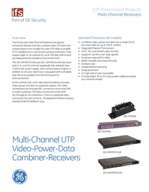 Datasheet for the GE Security UTP Multi-Channel Receivers, published in 2010. Document No: 003-3284, Rev: 60364A. 5 models including GEC-4VDPBC, GEC-16VDPBC, GEC-8PVPDTCHUB and 2 additional variants. Engineering specifications, wiring diagrams, and mounting dimensions.
