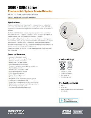Datasheet for the Gentex 8000 and 8003 Series Smoke Detectors. Document No: 551-0039-04. 6 models including 8000, 8003, 8100 and 3 additional variants. Detailed technical specifications, electrical ratings, and agency listings.