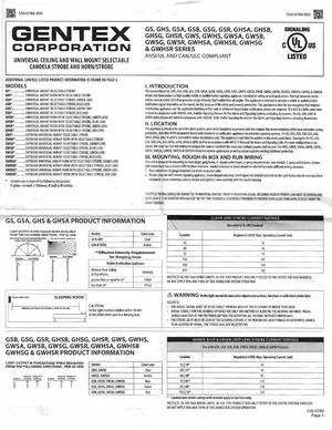 Installation Manual for the Gentex Commander 5 Strobes and Horn Strobes, published in 2023. Document No: 550-0788. 20 models including GS, GHS, GSA and 17 additional variants. Physical installation guide, backbox dimensions, and cabling specifications.