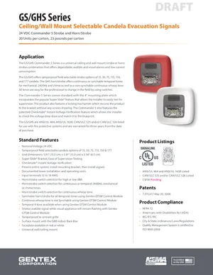 Datasheet for the Gentex GS/GHS Series. Document No: 551-0002-01. 8 models including GSR, GSPR, GSW and 5 additional variants. Engineering specifications, wiring diagrams, and mounting dimensions.