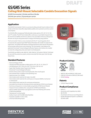Datasheet for the Gentex GS/GHS Series. Document No: 551-0002-01. 10 models including GS, GHS, GSR and 7 additional variants. Engineering specifications, wiring diagrams, and mounting dimensions.