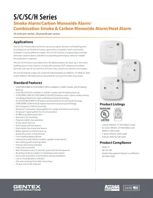 Datasheet for the Gentex S/C/SC/H Series. Document No: SCSCH-01. 13 models including S, SR, STRR and 10 additional variants. Product features, environmental operating limits, and compatibility data.
