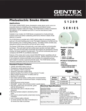 Datasheet for the Gentex S1209 and S1209F. Document No: 551-0001-02, Rev: 02. Models S1209 and S1209F. Detailed technical specifications, electrical ratings, and agency listings.