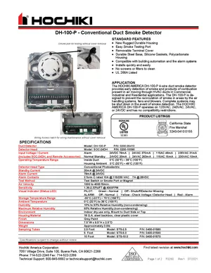 Datasheet for the Hochiki DH-100-P, published in 2021. Document No: F0260, Rev: 1. 11 models including DH-100-P, SOC-24DH, STS-2.5 and 8 additional variants. Product features, environmental operating limits, and compatibility data.