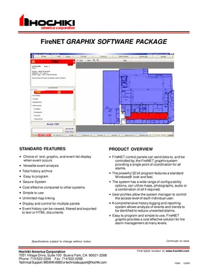 Datasheet for the Hochiki FireNET Graphix Software Package, published in 2008. Document No: F0084. 6 models including GUS1-4, GUS5-8, GUS9-16 and 3 additional variants. Detailed technical specifications, electrical ratings, and agency listings.