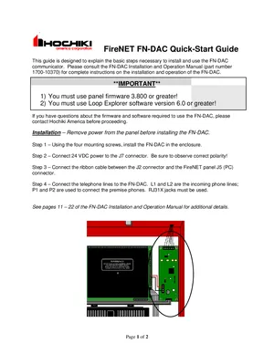 Quick Start for the Hochiki FN-DAC, published in 2008. Rev: 0.1. Model FN-DAC. Essential installation steps, basic configuration, and system power-up.