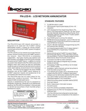Datasheet for the Hochiki FN-LCD-N, published in 2007. Document No: F0071, Rev: 02/2007. Models FN-LCD-N, FN-4127-IO and FN-LCD-S. Product features, environmental operating limits, and compatibility data.