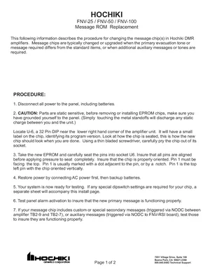 Manual for the Hochiki FNV-25, FNV-50 and FNV-100 Message ROM Replacement. 5 models including FNV-25, FNV-50, FNV-100 and 2 additional variants. Component descriptions, indicators and controls, and user interactions.