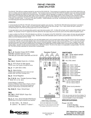 Installation Manual for the Hochiki FNV-4Z and FNV-2ZA. Document No: FNV-5022, Rev: E. 10 models including FNV-4Z, FNV-2ZA, EVX-4Z and 7 additional variants. Physical installation guide, backbox dimensions, and cabling specifications.