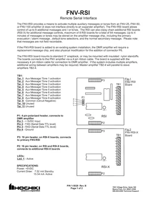 Installation Manual for the Hochiki FNV-RSI. Document No: 1-5029, Rev: B. 6 models including FNV-RSI, FNV-RSI-X, RSI-X and 3 additional variants. Physical installation guide, backbox dimensions, and cabling specifications.
