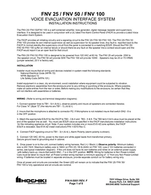 Installation Manual for the Hochiki FNV 25, FNV 50, and FNV 100. Document No: H-5001, Rev: F. 16 models including FNV 25, FNV 50, FNV 100 and 13 additional variants. Physical installation guide, backbox dimensions, and cabling specifications.