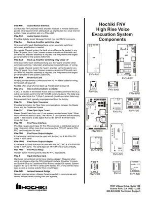 Datasheet for the Hochiki FNV High Rise Voice Evacuation. 32 models including FNV-AMI, FNV-ASC, FNV-BA and 29 additional variants. Detailed technical specifications, electrical ratings, and agency listings.