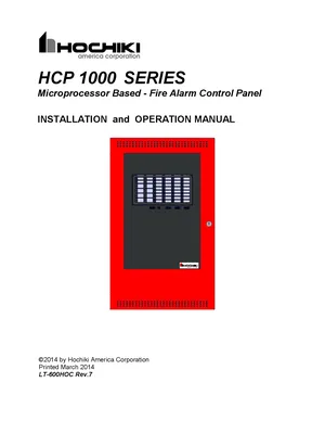 Installation, Operations, and Programming Manual for the Hochiki HCP 1000, published in 2014. Document No: LT-600HOC, Rev: 7. 33 models including HCP 1000, HCP-1008EDS, HMCC-1024-6DS and 30 additional variants. Mounting and wiring instructions, user operating guides, and system software setup.
