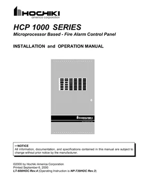 Installation and Operations Manual for the Hochiki HCP 1000 Series, published in 2000. Document No: LT-600HOC, Rev: 4. 27 models including HCP 1000, HMCC1024-6, HMCC1024-12 and 24 additional variants. Complete setup guide and operational workflows.