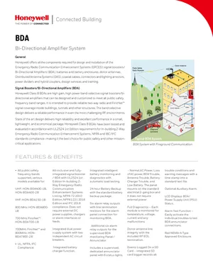 Datasheet for the Honeywell BDA Bi-Directional Amplifier System, published in 2018. Document No: HON-61014, Rev: A. 55 models including HON-BDA400-1B, HON-BDA400-2B, HON-BDA150-1B and 52 additional variants. Product features, environmental operating limits, and compatibility data.