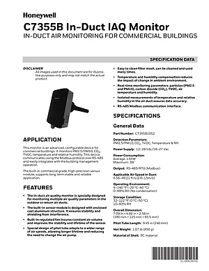 Datasheet for the Honeywell C7355B, published in 2020. Document No: 31-00439-01. Model C7355B1052. Product features, environmental operating limits, and compatibility data.