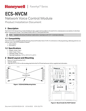 Installation Manual for the Honeywell ECS-NVCM, published in 2021. Document No: LS10169-001SK-E, Rev: B. Model ECS-NVCM. Physical installation guide, backbox dimensions, and cabling specifications.