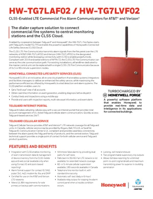 Datasheet for the Honeywell HW-TG7LAF02 and HW-TG7LVF02, published in 2021. Document No: HON-62049, Rev: A. 10 models including HW-TG7LAF02, HW-TG7LVF02, TG-7FS and 7 additional variants. Product features, environmental operating limits, and compatibility data.