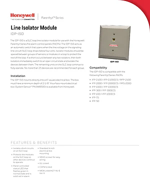 Datasheet for the Honeywell IDP-ISO Line Isolator Module, published in 2017. Document No: 350287, Rev: J. Model IDP-ISO. Detailed technical specifications, electrical ratings, and agency listings.