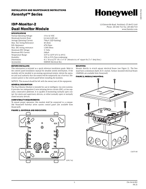 Installation Manual for the Honeywell IDP-Monitor-2, published in 2021. Document No: I56-3614-003, Rev: 04-21. Model IDP-Monitor-2. Hardware installation, terminal connections, and environmental requirements.