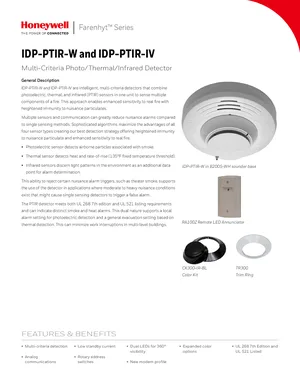 Datasheet for the Honeywell IDP-PTIR-W and IDP-PTIR-IV, published in 2019. Document No: FH-62009, Rev: A. 26 models including IDP-PTIR-W, IDP-PTIR-IV, B501-WHITE and 23 additional variants. Product features, environmental operating limits, and compatibility data.