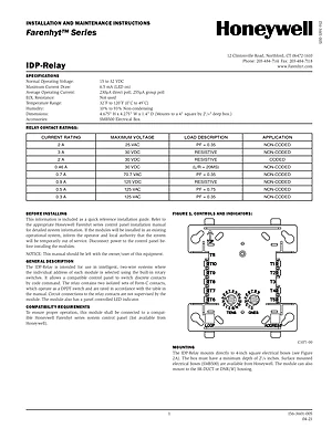 Installation Manual for the Honeywell IDP-Relay, published in 2021. Document No: I56-3601-005, Rev: 04-21. Model IDP-Relay. Physical installation guide, backbox dimensions, and cabling specifications.