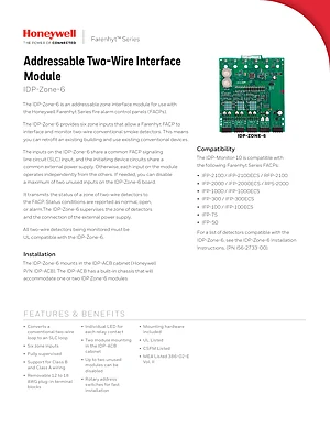 Datasheet for the Honeywell IDP-Zone-6, published in 2017. Document No: 350297, Rev: G. Model IDP-Zone-6. Product features, environmental operating limits, and compatibility data.