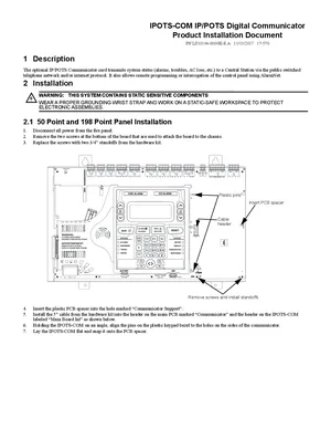 Installation Manual for the Honeywell IPOTS-COM, published in 2017. Document No: LS10184-000GE-E, Rev: A. Model IPOTS-COM. Physical installation guide, backbox dimensions, and cabling specifications.