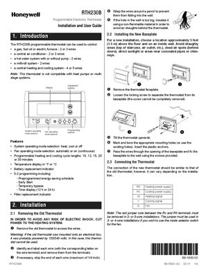 Installation, Operations, and Programming Manual for the Honeywell RTH230B, published in 2011. Document No: 69-1800-03. Model RTH230B. Mounting and wiring instructions, user operating guides, and system software setup.