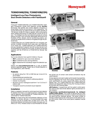 Datasheet for the Honeywell TC806D1049 and TC806D1056 Duct Smoke Detectors, published in 2006. Document No: HON-6955, Rev: A. 4 models including TC806D1049, TC806D1049CDN, TC806D1056 and 1 additional variants. Engineering specifications, wiring diagrams, and mounting dimensions.