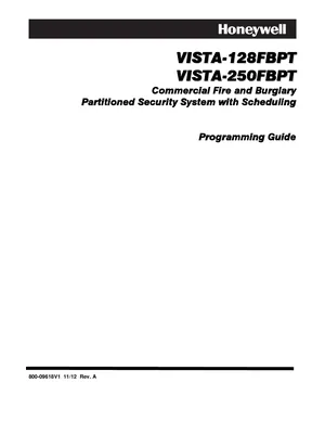 Programming Manual for the Honeywell VISTA-128FBPT and VISTA-250FBPT, published in 2012. Document No: 800-09618V1, Rev: A. Models VISTA-128FBPT and VISTA-250FBPT. Database setup, feature customization, and password management.